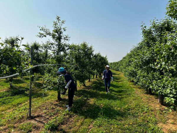 이날 직원들은 무더운 날씨에 구슬땀을 흘리며 사과 열매솎기 작업을 진행했다.
