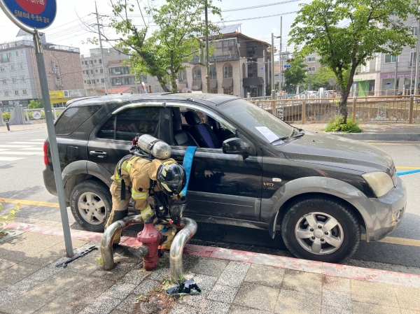불법 주차 차량으로 소방출동이 어려운 상황을 가정해 실시한 이번 훈련은 차량 이동기기를 활용한 강제 견인 소방차량 이용 불법 주차차량 돌파 후 통행 소화전 옆 불법 주차차량 창문파괴를 통해 소방호스 전개 후 소방용수 확보 순으로 진행됐다.