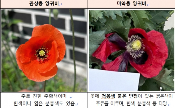 반면, 단속 대상이 아닌 관상용 개양귀비는 꽃봉오리와 줄기에 털이 많고 열매는 크기가 작고 도토리 모양을 띤다.