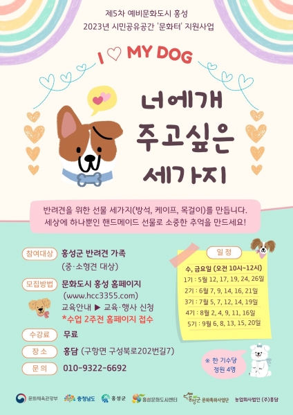 올해 프로그램은 중·소형견을 주제로 한 프로그램으로 문화도시홍성 홈페이지를 통해 신청접수를 할 수 있으며 대형견 관련 프로그램은 24년도에 기획될 예정이다.