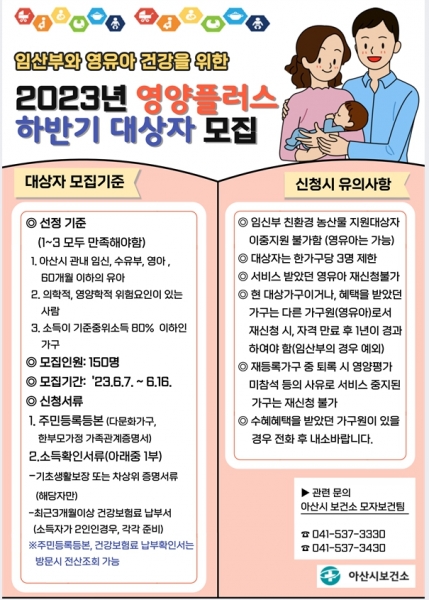 [Ytv영상스토리] 아산시는 영양측면의 위험 집단인 임산부와 영유아의 불균형 개선을 위한 2023년 하반기 영양플러스사업 신규 대상자를 모집한다.