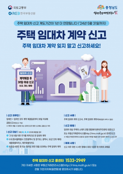 [Ytv영상스토리] 홍성군은 국토교통부에서 시행하는 주택 임대차 신고제의 계도기간이 당초 2023년 5월 31일에서 2024년 5월 31일로 1년 연장한다고 밝히며 임대차 거래시 확인을 당부했다.