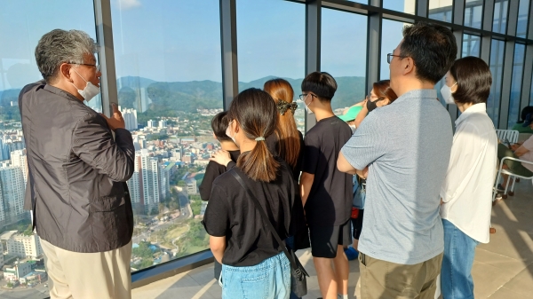 심 교수는 47층 타운홀 전망대에서 바라보는 천안 전경을 토대로 천안의 지리와 역사를 생생하게 전달했다.