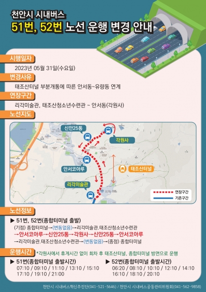 기존 종합터미널에서 리각미술관까지만 운행하던 51번·52번 시내버스를 종합터미널에서 리각미술관을 거쳐 태조산터널을 통과해 안서동까지 운행하도록 노선을 연장했다.