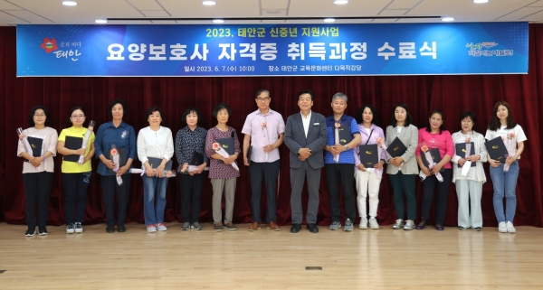 군은 7일 태안군교육문화센터 다목적강당에서 가세로 군수와 수료생 등 40여명이 참석한 가운데 ‘태안군 신중년 지원 사업- 요양보호사 자격증 취득과정 수료식’을 개최했다고 밝혔다.