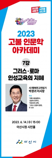 ‘지혜 사용설명서’, ‘공정이 먼저다’, ‘자유인의 선택’, ‘그리스 인문의 향연’ 등을 집필했으며 사단법인 행복한 고전읽기 이사장이기도 한 박경귀 시장은 이날 ‘그리스 로마 인성교육의 지혜’를 주제로 강연을 펼친다.