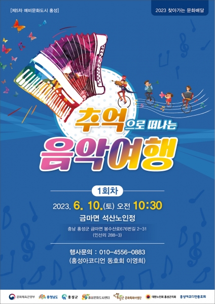 [Ytv영상스토리] 홍성문화도시센터의 ‘2023년 찾아가는 문화배달’지원사업에 선정된 홍성 아코디언 동호회의 ‘추억으로 떠나는 음악여행’공연이 6월 10일 오전 10시 30분에 금마면 석산 노인정에서 개최된다.
