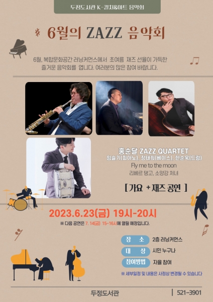 이번 음악회는 23일 ‘홍순달 JAZZ QUARTET’팀의 ‘6월의 JAZZ 음악회’를 시작으로 12월까지 총 5회에 걸쳐 진행된다.