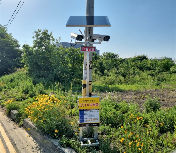 이번에 설치된 단속카메라는 태양광으로 생성된 전력으로 발광 다이오드 조명 안내판을 점등하고 주위 움직임이 감지될 때마다 무단투기 경고 방송이 송출하는 최신형 친환경 스마트 단속 장비이다.