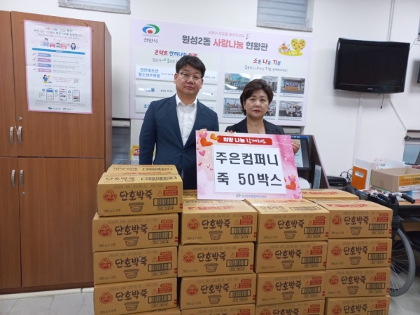 천안시 백석동 소재 주은컴퍼니는 지난 8일 저소득 어르신을 위한 죽 50박스를 원성2동에 기탁했다.