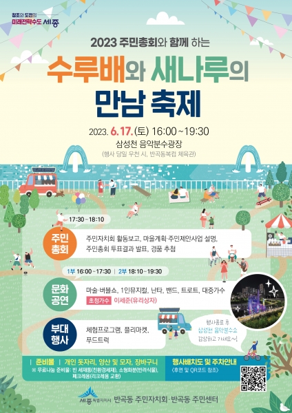 [Ytv영상스토리] 세종특별자치시 반곡동 주민자치회가 오는 17일 오후 4시부터 19시30분까지 삼성천 음악분수광장 일원에서 ‘2023 주민총회와 함께하는 수루배와 새나루의 만남 축제’를 개최한다.