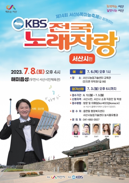 이완섭 서산시장은 “끼와 노래에 소질을 가진 시민분들은 KBS 전국노래자랑에 많이 참가해 주시길 바란다”며 “이번 전국노래자랑과 제14회 서산6쪽마늘 축제가 전 국민을 대상으로 서산시를 알리고 18만 서산시민이 화합하는 계기가 될 것”이라고 말했다.
