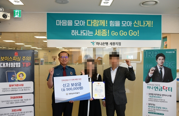 [Ytv영상스토리] 세종남부경찰서는 전화금융사기 피해를 예방한 하나은행 은행원 A씨에게 표창장을 수여하고 신고보상금을 지급했다고 12일 밝혔다.