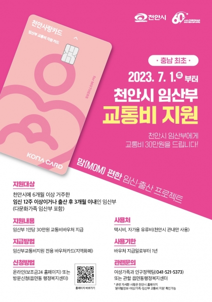 천안시, 7월 1일부터 임산부 교통비 30만원 지원