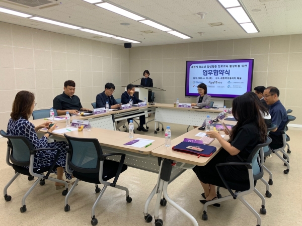 ‘세종시 청소년 양성평등 진로교육 활성화’를 위해 진행된 이번 협약식은 세종시청소년활동진흥센터, 남세종종합청소년센터, 북세종종합청소년센터, 새롬청소년센터, 조치원청소년센터, 고운청소년센터, 세종시청소년상담복지센터 7명의 센터장이 함께했다.