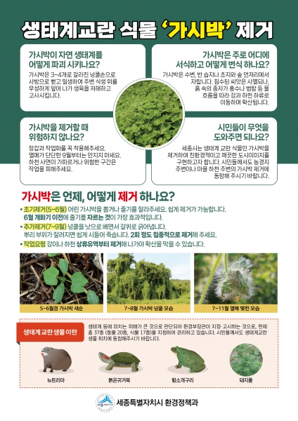 또한 강, 하천 등 수변을 따라 확산하는 가시박 특성을 고려해 세종시로 유입되는 강·하천의 상류지역인 인근 지자체에 가시박 제거 협조를 요청하고 유관단체 등 대시민 홍보도 추진 중이다.