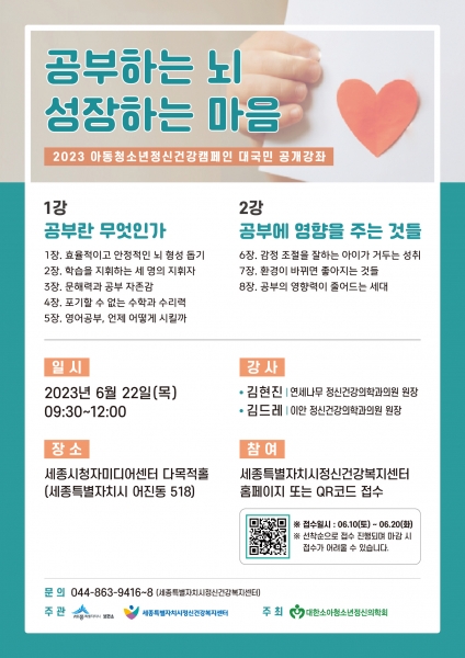 이번 강좌는 대한소아청소년정신의학회의 ‘아동·청소년 정신건강캠페인’ 20주년을 맞이해 마련됐으며 세종시정신건강복지센터가 주관하고 대한소아청소년정신건강의학회가 주최한다.