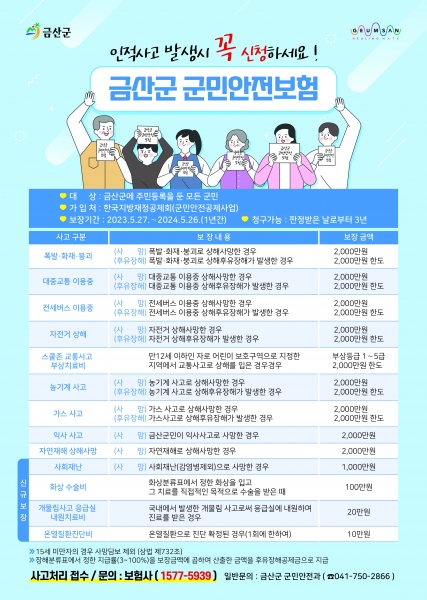 또한, 다른 지역에서 사고가 발생하더라도 보험금 지급이 가능하며 금산군에 전입 후 피해를 본 군민도 혜택을 받을 수 있다.