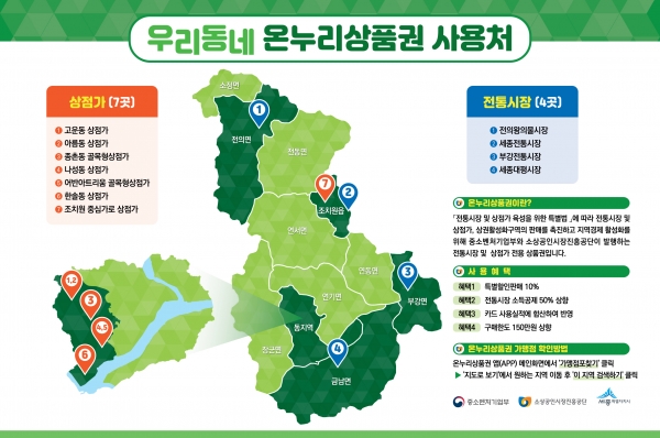 사용은 세종전통시장 세종대평시장 전의왕의물시장 부강전통시장 등 전통시장 4곳과 한솔 나성 아름 고운 종촌 나성어반아트리움 조치원중심가로 등 등록상점가 7곳에서 가능하다.