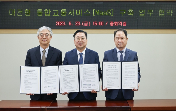 이날 협약은 이장우 대전시장, 민간 모빌리티 플랫폼 업체인 티머니 김태극 대표이사, 대전교통공사의 연규양 사장이 참석한 가운데 진행됐다.