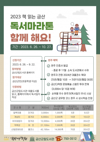 독서마라톤 운영은 책 1쪽을 거리 3m로 환산해 기간 내 목표 도서량을 완주하면 인증서 발급, 내년 대출 권수 확대, 금산다락원 문화예술 스탬프투어 점수 부여, 우수 완주자 시상 등 혜택을 받을 수 있다.
