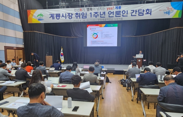 [Ytv영상스토리] 이응우 계룡시장은 28일 계룡문화예술의전당에서 취임 1주년 기자 간담회를 열고 민선8기 1차년도 시정 주요 성과 및 향후 시정 운영 방향에 대해 밝혔다.