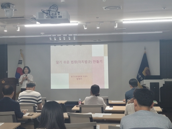 이번 교육을 통해 직원들이 자치법규 입안과 정비 방향 설정에 대한 기초를 다지고 폭넓게 이해하길 바란다”며 “앞으로도 실무 직원들의 전문성 강화를 위해 다양한 실무 맞춤형 법제교육을 확대해 직원 내부역량 강화에 적극 노력하겠다”고 말했다.