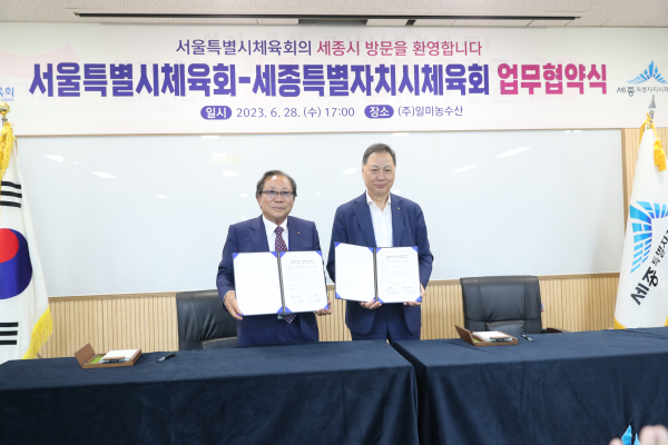 [Ytv영상스토리] 세종특별자치시체육회는 6월 28일 일미농수산에서 서울특별시체육회와 업무협약을 맺고 향후 상호 발전과 체육 발전 전반에 걸친 다양한 업무 협조를 약속했다.