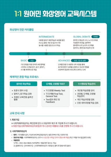 부여군 관내 초·중·고등학교 재학생 및 주소지가 부여군으로 등록된 성인을 대상으로 총 3개월 과정이며 학습의 효과를 극대화하기 위해 원어민 강사와의 1:1 맞춤형 수업으로 이루어진다.