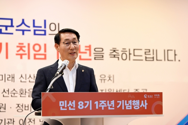 민선 8기 홍성 군정 키워드는 ‘동행과 행복’으로 식전 축하 공연, 유공자 시상, 1주년 발자취 영상 시청, 기념 선물 전달 등으로 약소하면서도 군정 비전을 담아 내실 있는 행사로 진행됐다.