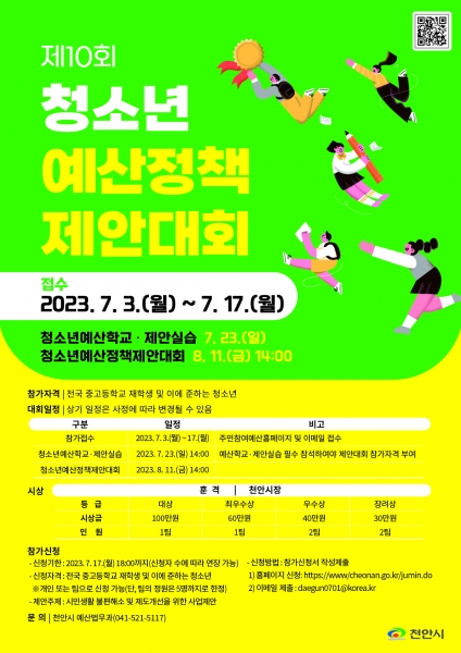 참가 대상은 전국 중고등학교 재학생 또는 이에 준하는 청소년이고 신청은 7월 3일부터 17일까지 천안시 주민참여예산 누리집에서 할 수 있다.