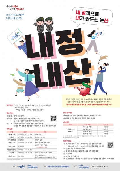 논산시·논산시청소년행복재단 주최, 제17기 논산시청소년참여위원회 주관으로 열리는 공모전 ‘내정내산’은 청소년이 스스로 지역사회 내의 문제들을 발견하고 해결에 필요한 정책 아이디어를 발굴해볼 수 있는 사회참여의 장을 펼치고자 마련됐다.