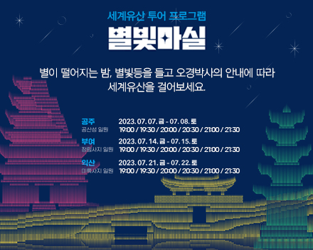 별빛마실 프로그램 중 ‘오경박사와 함께하는 별빛마실 투어’는 예약제로 운영되는데, 7월 3일부터 2023 세계유산축전 – 백제역사유적지구 홈페이지를 통해 사전신청을 할 수 있다.