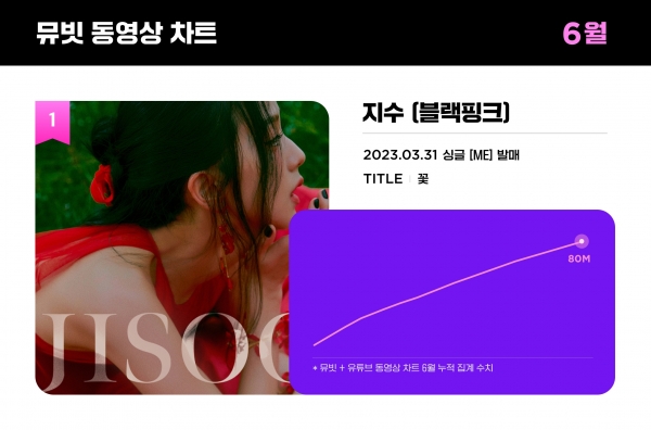 글로벌 팬덤 플랫폼 뮤빗이 발표한 6월 동영상 차트 결과에 따르면 3월 발매한 지수의 첫 솔로곡 ‘꽃’ MV가 최다 조회 수를 기록하며 1위를 차지했다.