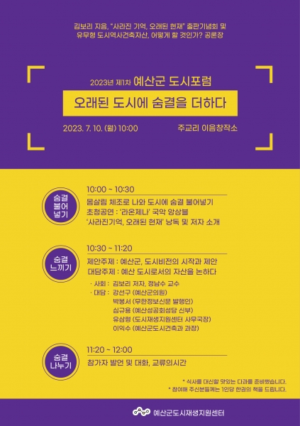 정남수 예산군도시재생지원센터장은 “일제강점기 만들어진 미곡창고를 재생한 ‘이음창작소’에서 포럼이 진행된다”며 “도시 가치향상과 원도심 재생을 위해 포럼을 비롯한 다양한 민관 협업 프로그램을 지속적으로 추진해 나가겠다”고 말했다.
