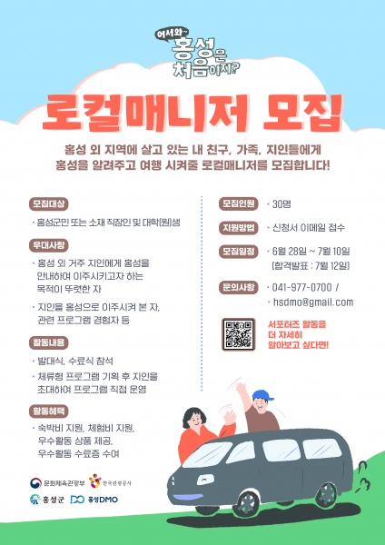 홍성군 황선돈 문화관광과장은 “이번에 모집하는 ‘어서와 홍성은 처음이지’ 로컬 매니저의 활발한 활동을 통해 홍성에 방문한 분들이, 홍성만의 매력을 느껴 생활인구로 이어지기를 기대해본다”고 밝혔다.