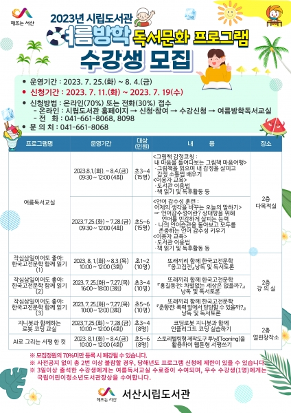 [Ytv영상스토리] 충남 서산시가 여름방학을 맞아 11일부터 19일까지 ‘여름아, 읽자’ 독서문화프로그램의 신청자를 모집한다고 밝혔다.