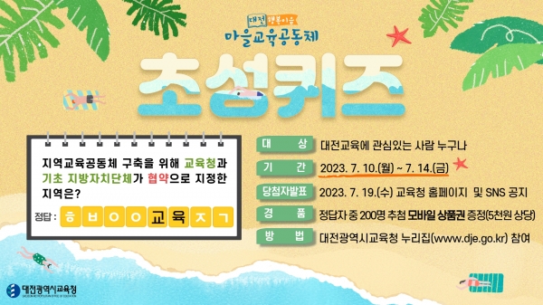 [Ytv영상스토리] 대전광역시교육청은 7. 10. ~ 7. 14.까지 5일간 마을과 학교가 협력해 아이들의 배움과 성장을 지원하는 대전마을교육공동체 홍보를 위한 퀴즈 이벤트를 진행한다고 밝혔다.