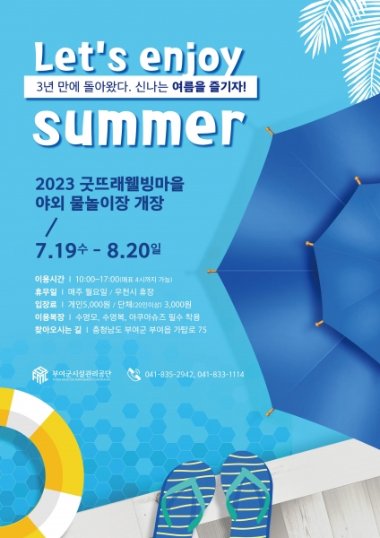 시설 운영을 담당하는 부여군시설관리공단의 윤상철 이사장은 “여름철 더위로 야외 물놀이장을 찾는 고객들이 맘 편히 물놀이를 즐길 수 있도록 운영기간 쾌적하고 안전한 시설을 제공할 수 있도록 노력하겠다”고 말했다.