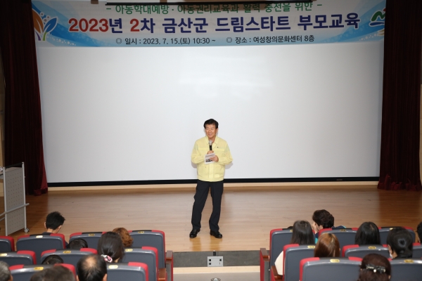 박범인 금산군수는 이날 강의장을 찾아 교육에 참여한 학부모에게 금산군드림스타트 사업의 취지를 설명하고 개선 방향에 관한 의견을 듣는 시간을 가졌다.