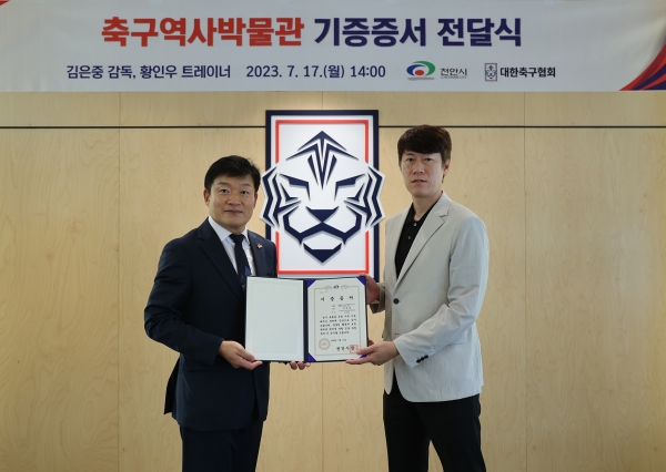 [Ytv영상스토리] 천안시는 지난 17일 대한축구협회 축구회관에서 축구역사박물관 건립을 위해 유물을 기증한 김은중 감독과 황인우 트레이너에게 기증증서를 전달했다.