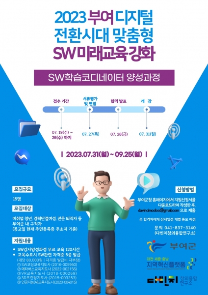 군 관계자는 “SW교육에 대한 아이들과 학부모의 관심이 높지만 해당 교육을 할 수 있는 강사진이 관내에 많지 않다는 문제가 있어 부여군에서 직접 강사진을 육성하게 됐다”며 “앞으로도 SW교육 분야의 취창업 수요가 기대되는 만큼 새로운 일자리 창출은 물론 지역 아동들에게도 SW를 경험할 수 있는 기회가 되길 기대한다”고 말했다.