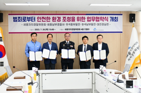 이번 업무협약식은 한국중부발전·한국남부발전 등 공기업과 대전경실련 도시안전디자인센터, 세종시자치경찰위원회, 세종남부경찰서 간 상호협력 하에 범죄로부터 안전한 환경 조성을 위한 CPTED 개선사업을 추진하기 위한 것이다.