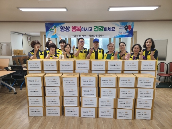 금성면지역사회보장협의체는 위원 13명이 참여한 가운데 폭염에 취약하고 건강관리 돌봄이 필요한 가정 80곳을 위한 여름철 건강꾸러미 식품 나눔에 나섰다.