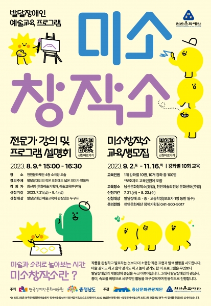 한국장애인문화예술원과 충청남도가 주최하고 충남문화관광재단과 천안문화재단이 주관한 미술과 소리로 놀아보는 시간 ‘미소창작소’ 발달장애인 초·중·고등학생을 대상으로 운영된다.