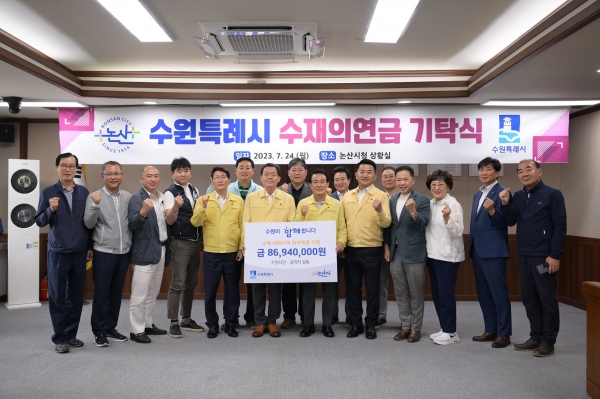 지난 24일 이재준 수원특례시장은 김기정 수원특례시의회 의장과 함께 직접 논산시청을 방문해 수원시민, 공직자, 협업 기관 직원이 모금한 8,694만원의 성금을 전했다.