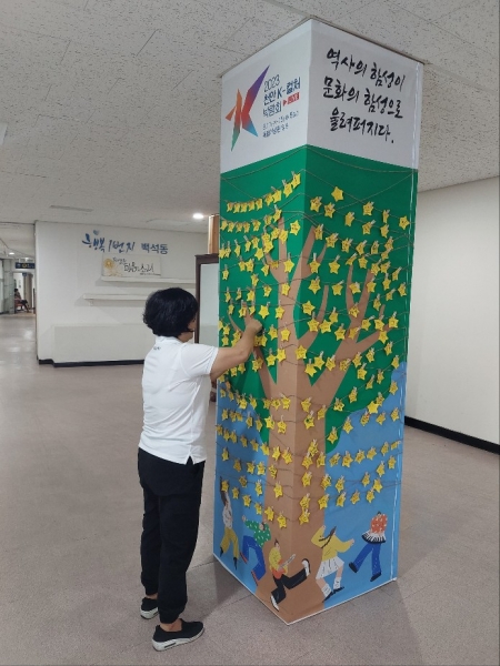 [Ytv영상스토리] 천안시 백석동이 오는 8월 열리는 K-컬처박람회의 성공 개최를 기원하며 청사 출입구에 포토월과 소원 트리를 설치하고 박람회 홍보 대형 현수막을 게시하는 등 적극적인 홍보에 나섰다.