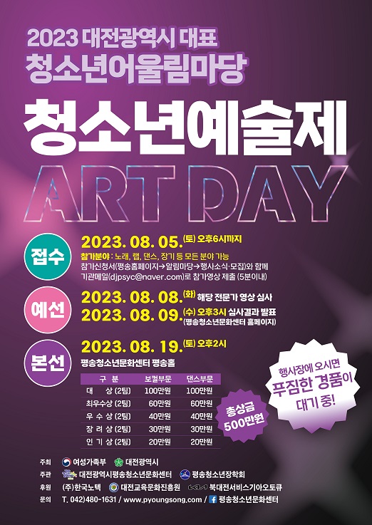 [Ytv영상스토리] 대전시는 제4차 청소년어울림마당인 ‘청소년 예술제 ART DAY’를 오는 8월 19일 오후 1시에 평송청소년문화센터에서 개최한다고 밝혔다.