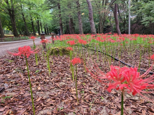 진악산 산림욕장 꽃무릇 단지는 지난 2021년부터 보석사 은행나무 및 일주문 인근에 꽃무릇 25만7000본이 식재됐으며 올해 2억원을 투입해 보석사~영천암 구간에 꽃무릇 19만 본을 추가로 식재하고 포토존도 조성할 예정이다.
