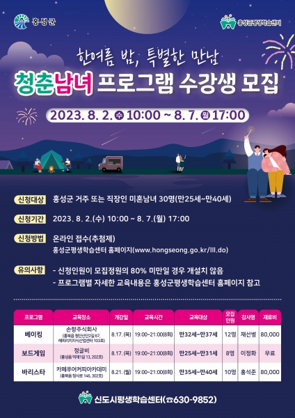 청춘남녀 프로그램은 평생학습을 통해 미혼남녀가 서로 소통하고 교류하며 지역에 안정적으로 정착할 수 있는 분위기를 조성하고자 기획됐으며 홍성군에 거주하거나 근무 또는 활동 중인 만 25세~만 40세 미혼남녀 30명을 대상으로 베이킹, 보드게임, 바리스타 등의 프로그램을 운영할 예정이다.